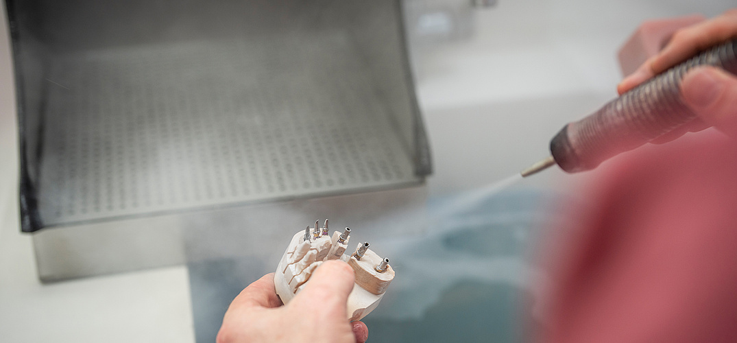 Eine Alternative dazu, gerade bei wenig Knochenangebot, ist die Stegprothese. Sie stört weder beim Sprechen noch beim Kauen. Die Stegprothese ist deshalb so beliebt, weil sie so effektiv ist: Sie bietet eine stabile Verankerung einer Vollprothese, die durch den Steg gewährleistet wird. Selbst unter Belastung bewegt sich die Prothese nicht.